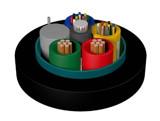GDTS 型光電混合纜的結構是將單模或多模光纖裝入由高模量的聚酯材料做成的松套管中,套管內填充防水化合物。纜芯的中心是一根金屬加強芯,對于某些芯數(shù)的光纜來說,金屬加強芯外還需擠上一層聚乙烯。松套管和所需規(guī)格的絕緣銅導線圍繞中心加強芯絞 合成緊湊的圓形纜芯,纜芯內的縫隙充以阻水填充物。雙面鍍鉻涂塑鋼帶(PSP)軋紋 縱包后擠制聚乙烯護套成纜。