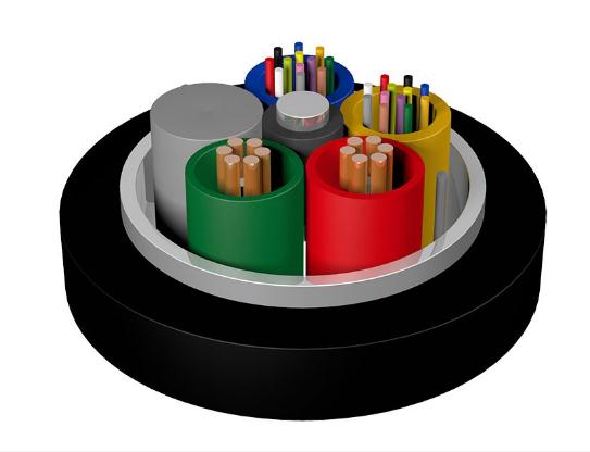 GDTA 型光電混合纜的結構是將單?;蚨嗄9饫w裝入由高模量的聚酯材料做成的松套管中,套管內(nèi)填充防水化合物。纜芯的中心是一根金屬加強芯,對于某些芯數(shù)的光纜來說, 金屬加強芯外還需擠上一層聚乙烯。松套管和所需規(guī)格的絕緣銅導線圍繞中心加強芯絞 合成緊湊的圓形纜芯,纜芯內(nèi)的縫隙充以阻水填充物。涂塑鋁帶(APL)縱包后擠制聚乙烯護套成纜。